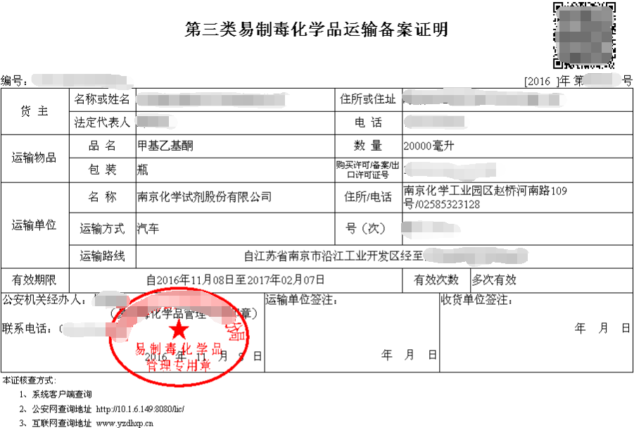 易制毒化學(xué)品運(yùn)輸備案證明樣圖