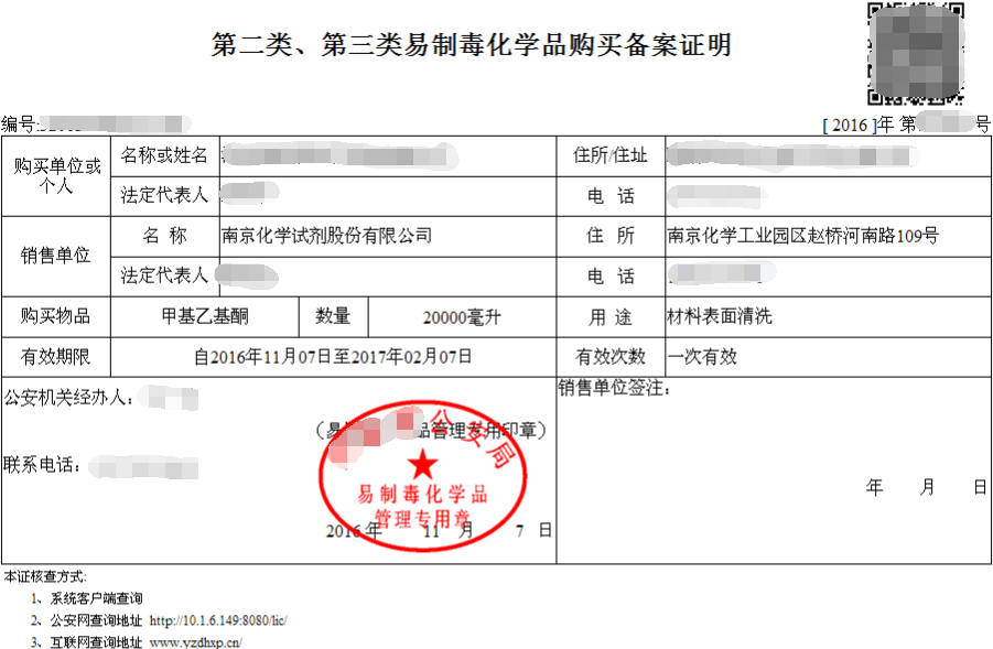 1.易制毒化學(xué)品購買備案證明 | 銷售方需提供: 1.營業(yè)執(zhí)照; 2.非藥品類易制毒化學(xué)品生產(chǎn)備案證明; 3.危險(xiǎn)化學(xué)品經(jīng)營許可證; 4.安全生產(chǎn)許可證; 5.銷售合同; 采購方需提供: 1.易制毒化學(xué)品購買申請表; 2.營業(yè)執(zhí)照(尚未三證合一的提供營業(yè)執(zhí)照、組織機(jī)構(gòu)代碼證、稅務(wù)登記證); 3.經(jīng)辦人及法人信息; | 《易制毒化學(xué)品購買備案證明》由購買方到當(dāng)?shù)毓簿只蛘呔W(wǎng)絡(luò)平臺自行辦理。所需銷售方提供的資料向銷售業(yè)務(wù)員索取。 |