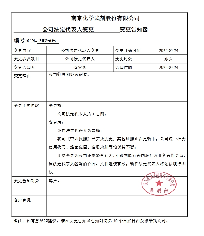 南京化學試劑股份有限公司法定代表人變更:由王志剛變更為戚楠,變更日期2025.03.24,詳情如下: