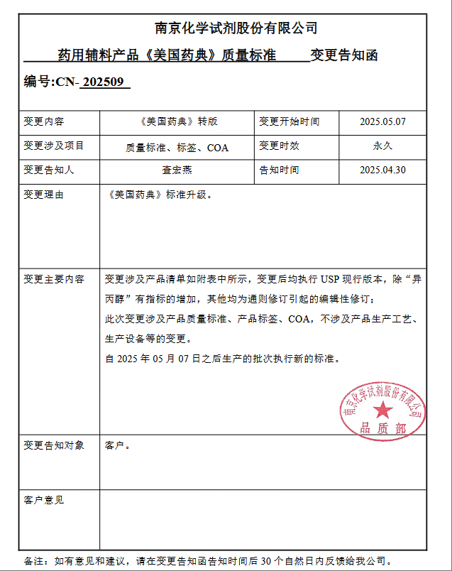 首頁 > 新聞中心 > 企業公告 藥用輔料產品《美國藥典》質量標準變更告知函