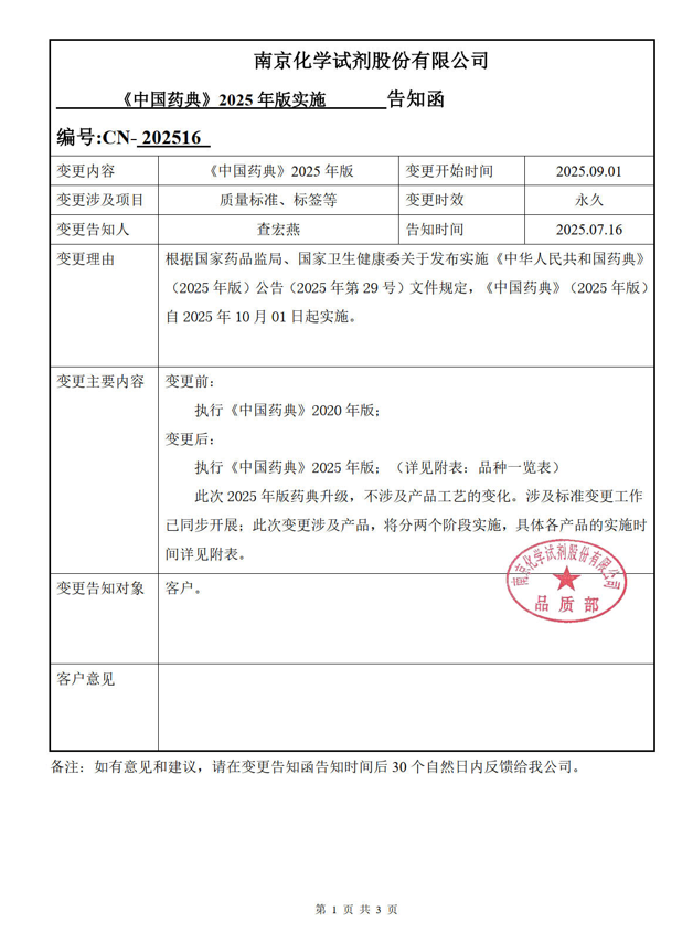 執(zhí)行《中國(guó)藥典》2025 年版;此次 2025 年版藥典升級(jí),不涉及產(chǎn)品工藝的變化。涉及標(biāo)準(zhǔn)變更工作已同步開(kāi)展;此次變更涉及產(chǎn)品,將分兩個(gè)階段實(shí)施,具體各產(chǎn)品的實(shí)施時(shí)間詳見(jiàn)附表!