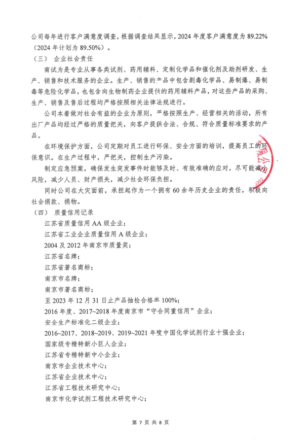 《南京化學試劑股份有限公司質量信用報告》回顧了南京化學試劑在質量管理、產品質量責任、質量誠信管理等方面的方針、制度、措施及取得的成效。關于報告的內容,說明如下: