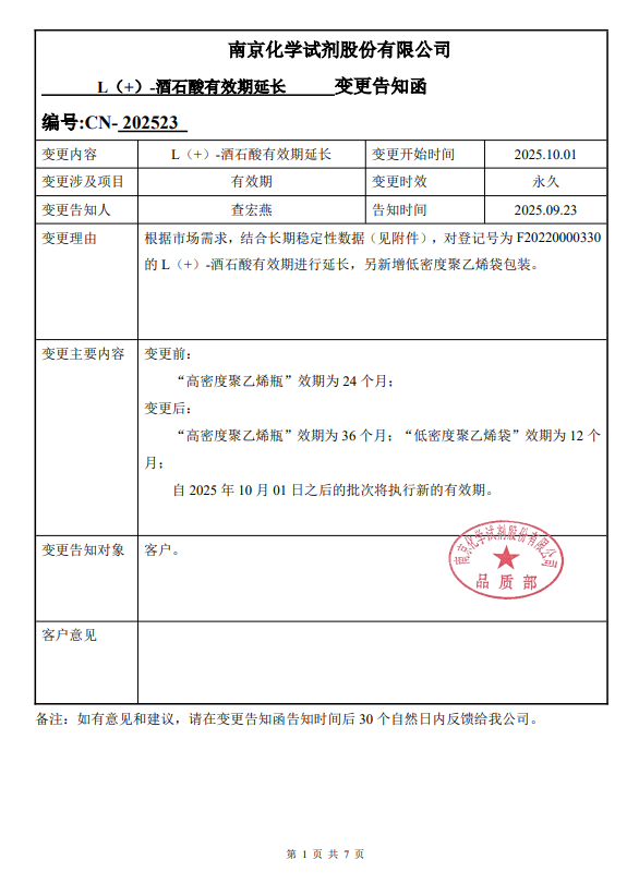根據市場需求,對登記號為F20220000330的 L(+)-酒石酸有效期進行延長,另新增低密度聚乙烯袋包裝。